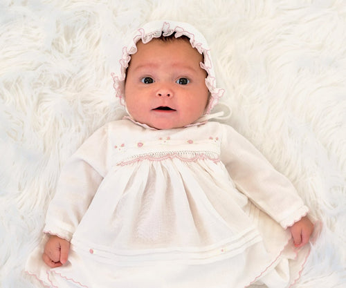 Ivory/pink baby dress & bonnet
